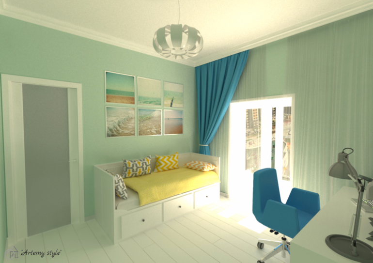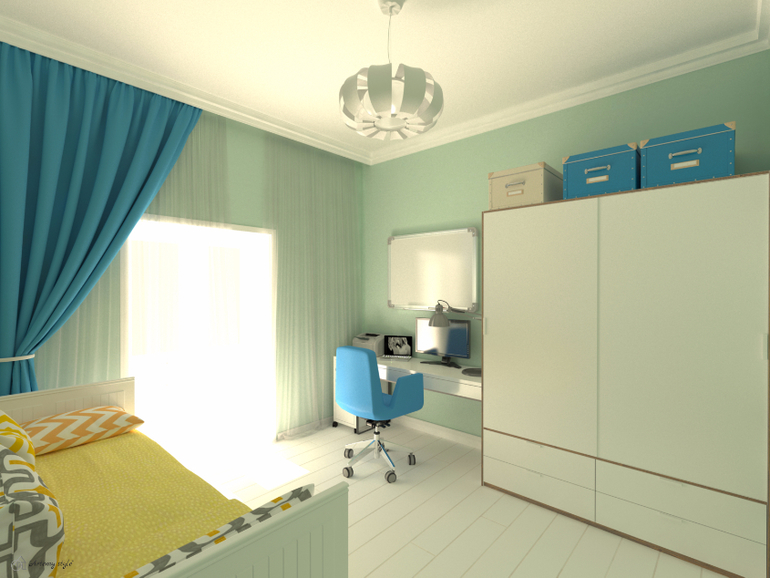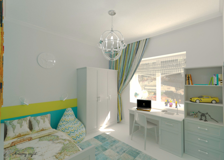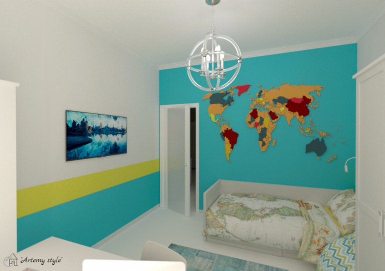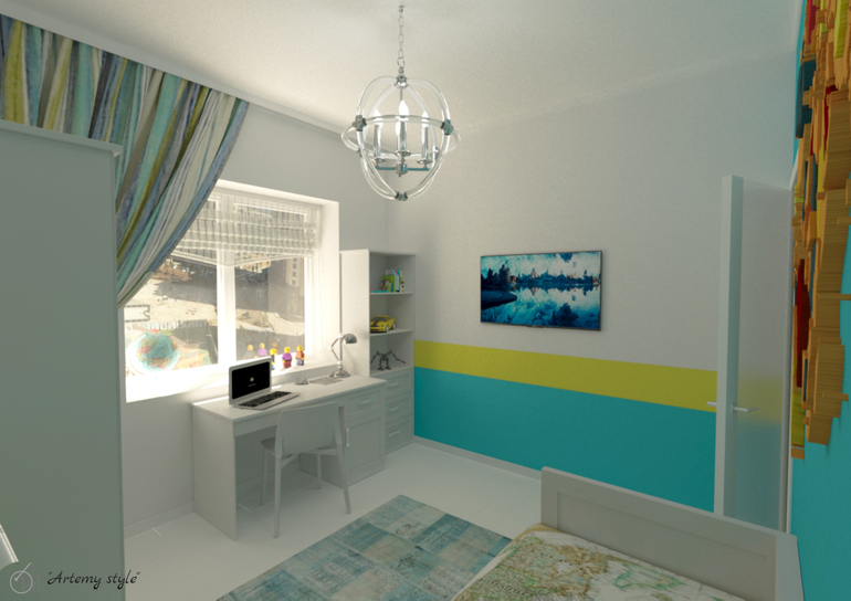 Детская планируется для мальчика - школьника, мебель подбиралась исходя из этого. Принят был яркий вариант комнаты, пано - карту буду изготавливать на заказ:)