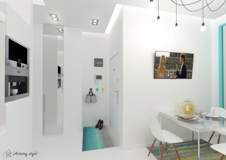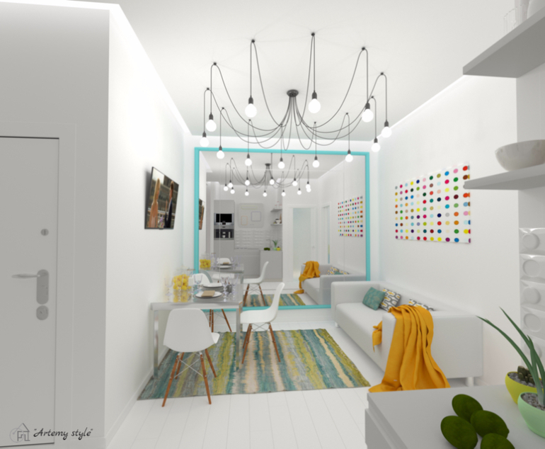 Гостиная и столовая зона у нас получается без окон, для расширения пространства будет зеркало в обрамлении бирюзовых молдингов. В этом пространстве будет реализовано три варианта освещения.