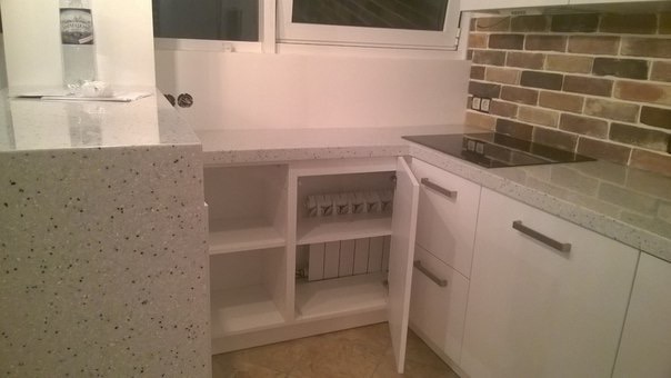 Помимо нестандартных окон есть еще особенность на кухне в том,что под столешницей у окна спрятана батарея.для поступления воздуха к окнам предусмотрены щели в столешнице.боковые дверцы сделаны на магнитах,чтобы не мешать открыванию ящиков.внутри тепло,так что использую там пространство еще и как сушку)
