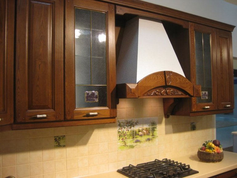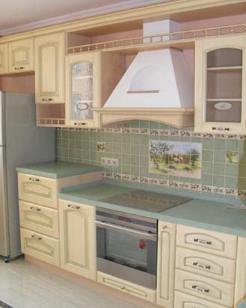 у мен6я кухня подобная со светлозеленой патиной. Плитка крупная глянцевая тоже светло-светло зеленая. Мне очень нравится.