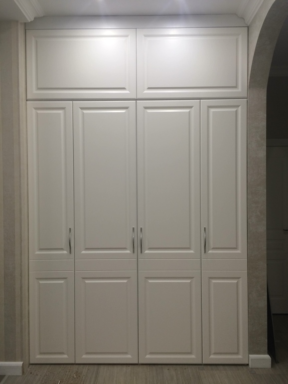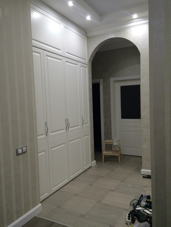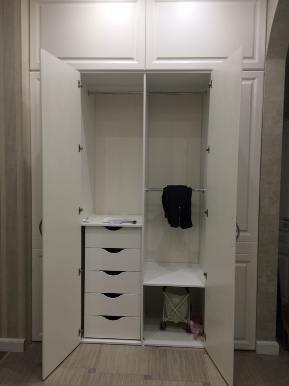 Ниша для шкафа была даже на плане БТИ, решили ее и оставить. Размер 190х80. Потолки высокие, поэтому купе сразу отмела, тк делать фальш сверху, посчитала кощунством. Это место только для верхней одежды и сезонной обуви (но поставив её, я поняла, что туда же и коробки с не сезоном засуну, нашей с мужем), шапок шарфов и тд. И отдельная дверца для пылесоса, стремянки, швабры и тд.