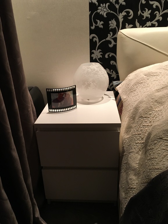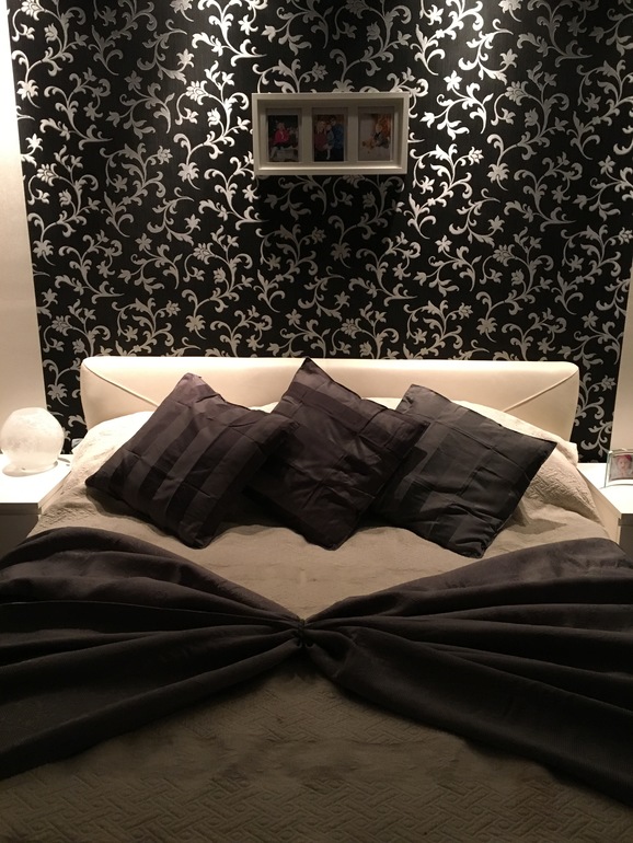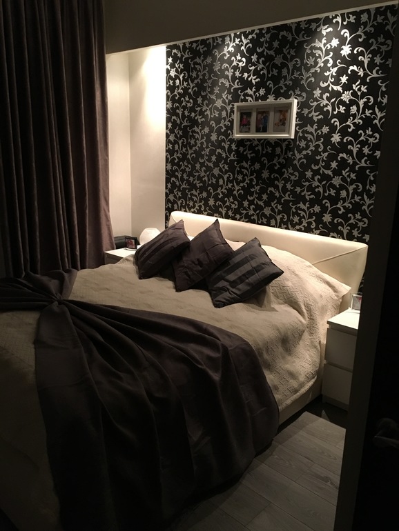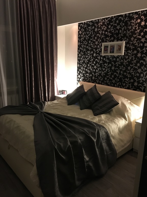 Интерьерное решение спальниВот такая вот спальня у нас получилась . Ещё нужно повестить телевизор , где сейчас висят часы и погладить шторку , которая закрывает гардеробную ) жду ваше мнение ) не судите строго))))