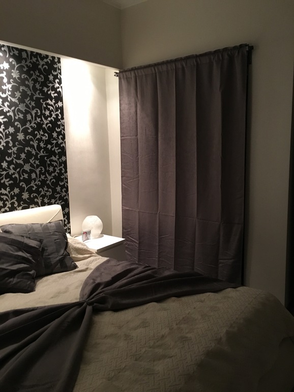 Прекрасная спальня,обстановка интимная,то что нужно,для любви и отдыха))) Шторку для гардеробной,если есть возможность,повесьте внутрь,думаю будет лучше)