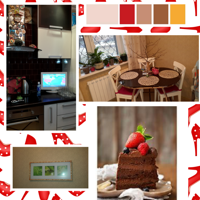 Второе, это картина... Может, будет лучше, заменить картинки на другую цветовую гамму, входящую в нашу кухню(ваниль,шоколад, кофе, сливки,клубника, золото) и на кухонную тематику?