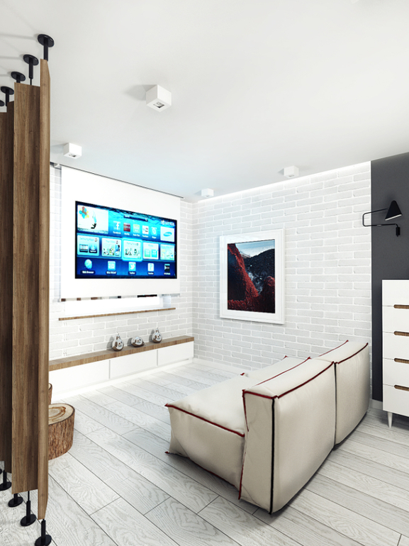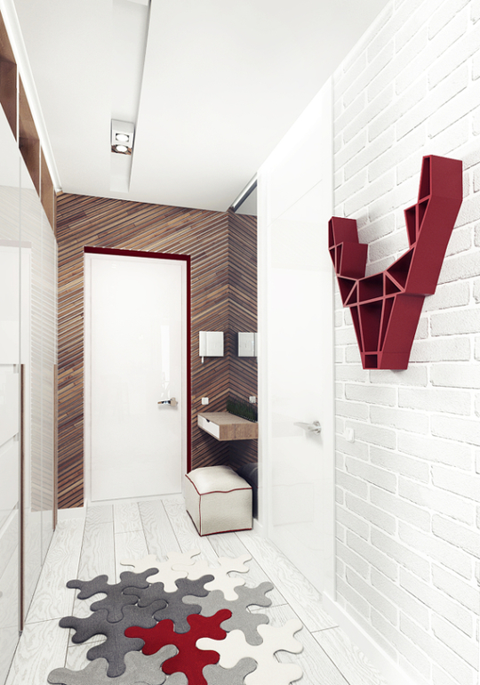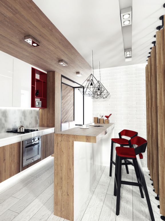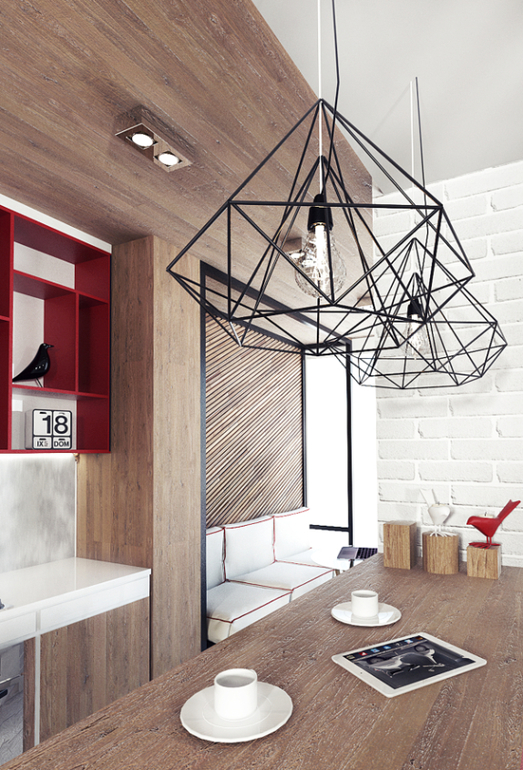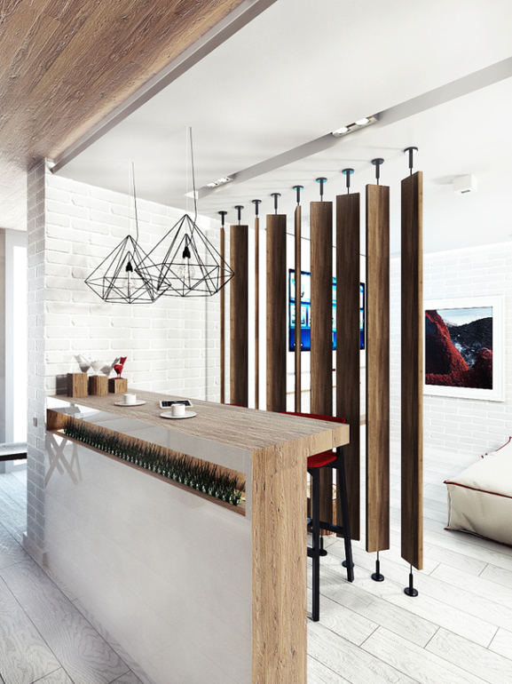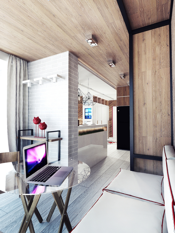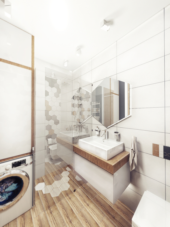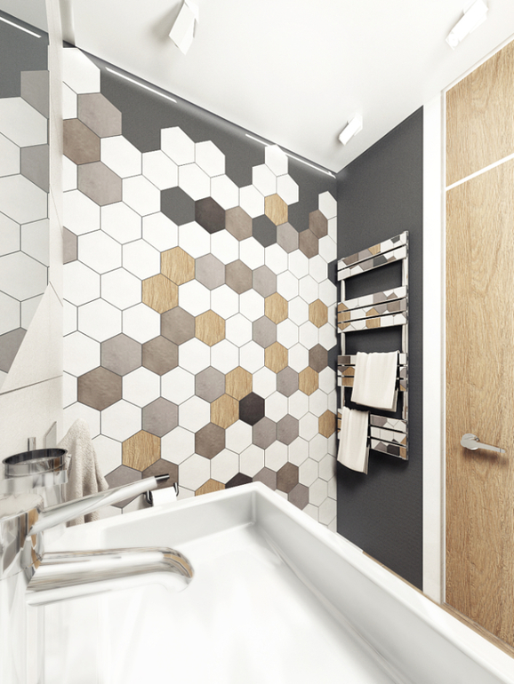 Квартира общей площадью в 46 м2 вместила в себя: прихожую, гостиную, спальню, кухню с барной стойкой, лаунж-зону с обеденным столом и невероятную «гексагональную» ванную комнату. Одной из основных задач было использование дерева во всех его проявлениях (на полу, на потолке, и даже в виде ширм). Яркие цветовые акценты, паттерны из бруса, стильные металлические изделия - все это новый дизайн-проект от IK-architects.