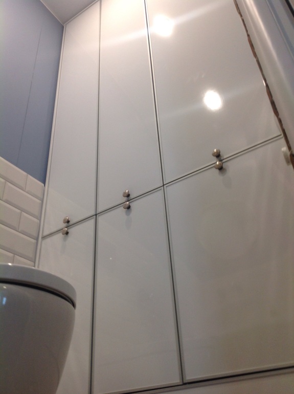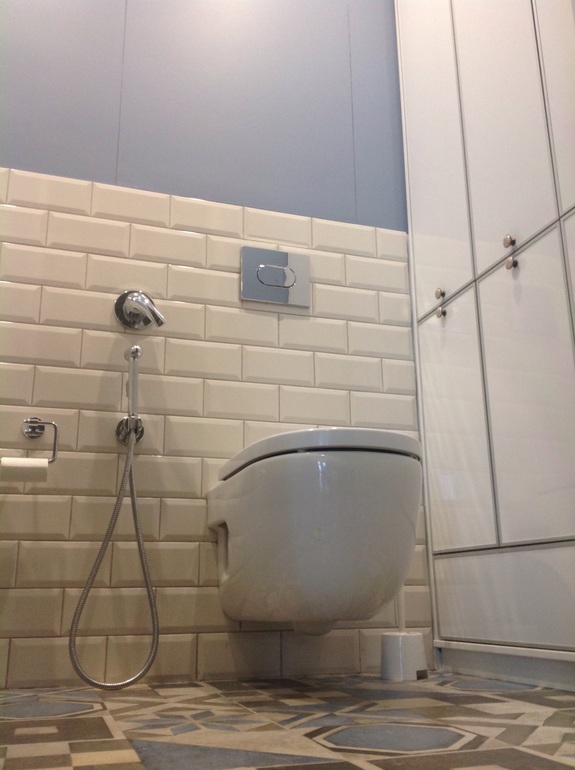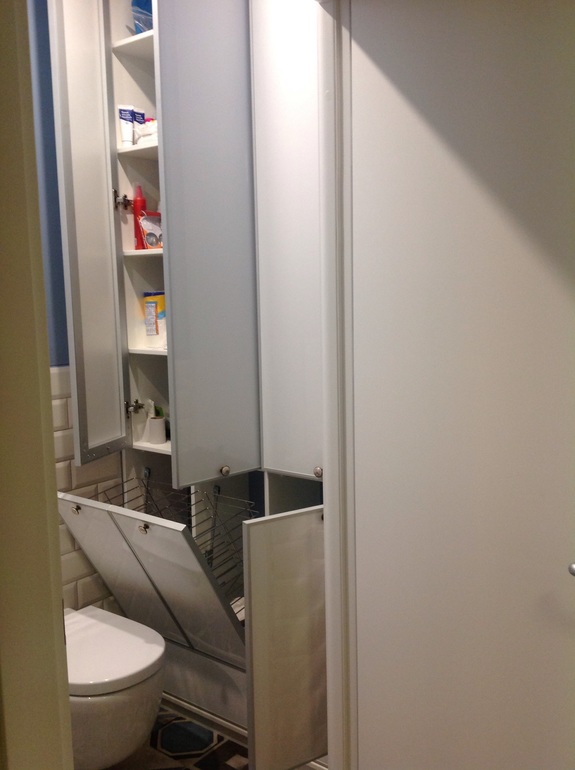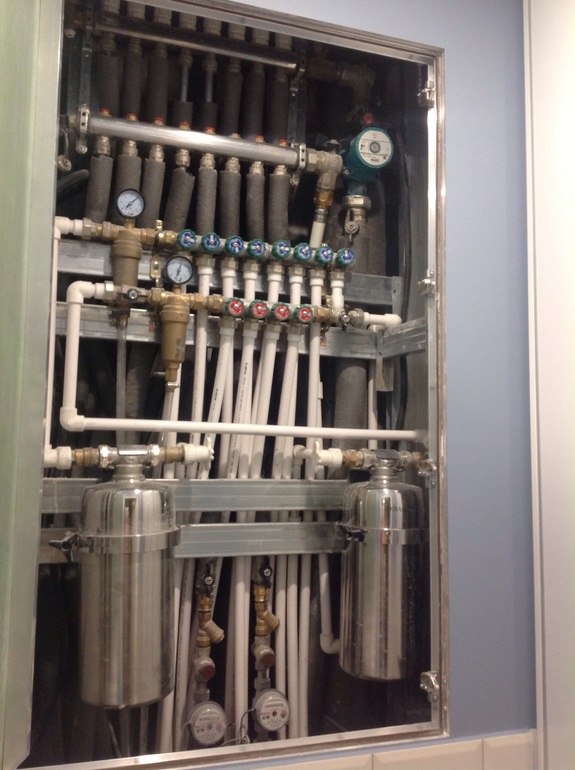 Особенность помещения еще и в том что, за унитазом вмонтирована вся система регулировки батарей всей квартиры,фильтры на воду,счетчики, а также 100л бойлер! Доступ ко всему этому добру с помощью гигантского люка.