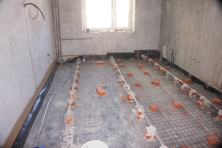 5) Вставка металлической сетки в стяжку. Т.к. дом новострой, дом первые 5 лет "ходит", металлическая сетка сделает более упругой стяжку. До нас данная команда никогда не делала с сеткой стяжку, данный момент они делали с бумажкой-инструкцией... Выглядело так: