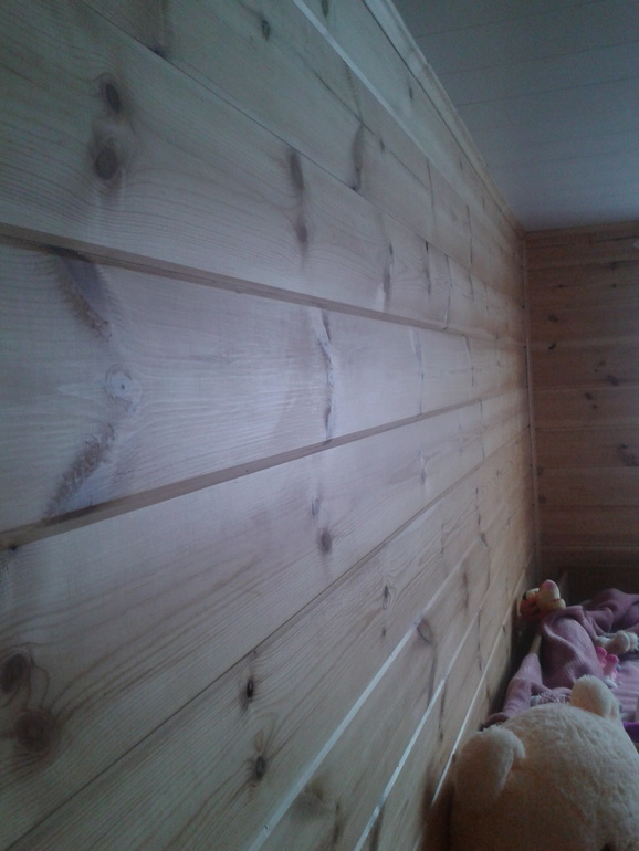 На фото стены крашены в 2 слоя, если в 3, то будет явная белесость. Не блестит, мягкий цвет получается. Можно добавлять коллер и получить полупрозрачный белый цвет. Фото делала у знакомых. Данную краску советует плотник со стажем работы более 50 лет. Он нам как раз дом и отделывает потихоньку. Это не просто лак, а пропитка, защищающая древесину от УФ лучей, не будет сереть и желтеть от солнца.