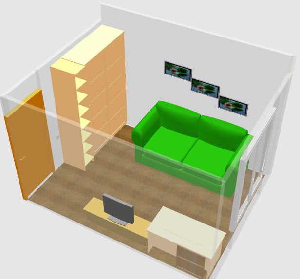 По расположению мысли пока вот так - шкаф-купе с круглыми полками с одной стороны и кровать (еще буду думать, переставлять мебель)