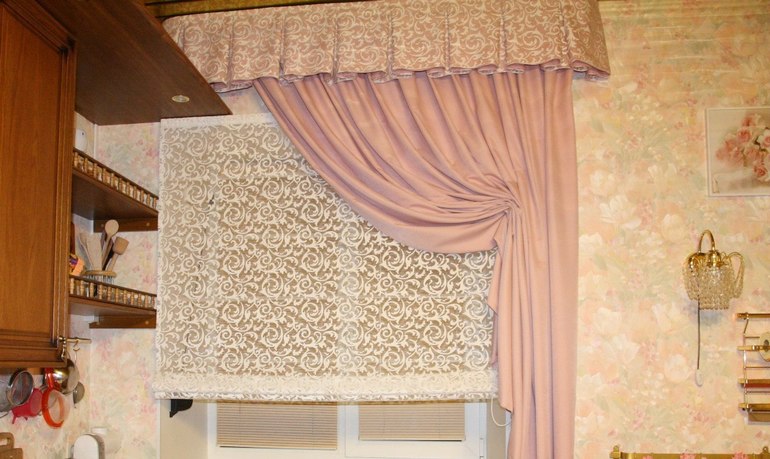 Я бы на кухню повесила вуаль и на левый бок защепила ее, только с правого края прицепить ее с края карниза, чтобы не двигалась. И карниз под потолок от стены до стены.
