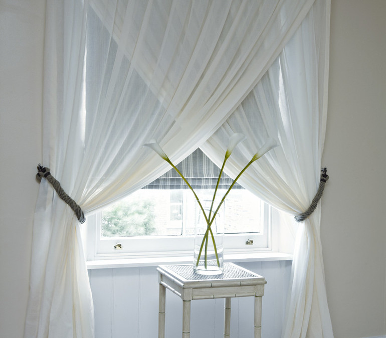 тюль или органзу на бок, в несколько слоев можно, разные цвета можно совместить, например белый (молочный) и голубой, легкую такую и все в один бок закрепить. Римские прямо сухенько будет, мне кажется.