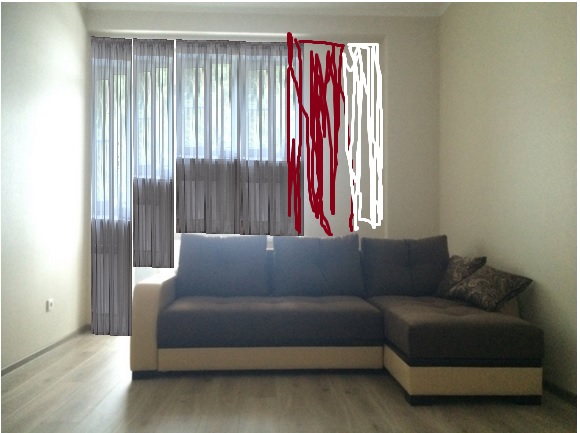 Задача 1 - Кухня. Изначально планировался карниз под под потолком от края до края стены. Серые прямые шторы до пола и белая тюль. Планы нарушил диван, который пришлось буквально запихнуть между стеной и холодильником.