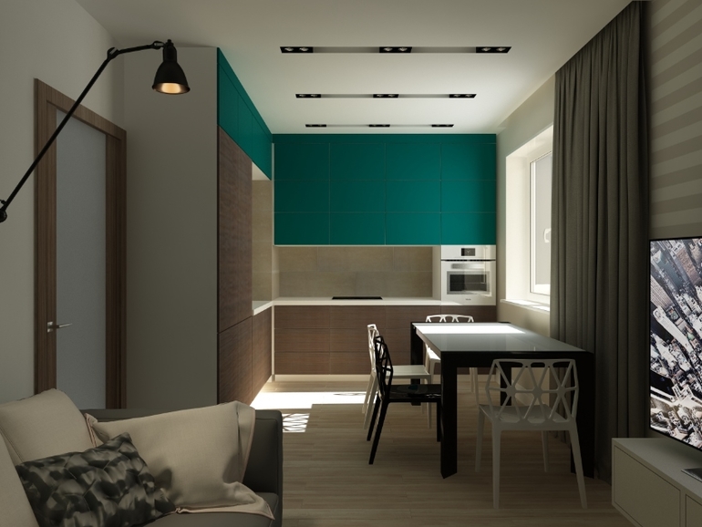 Кухня и гостиная. Заказчики предпочитают теплые тона. Но образ получился скучный, однообразный. И тогда ворвался к нам цвет) Изумрудный! Очень понравился заказчикам)