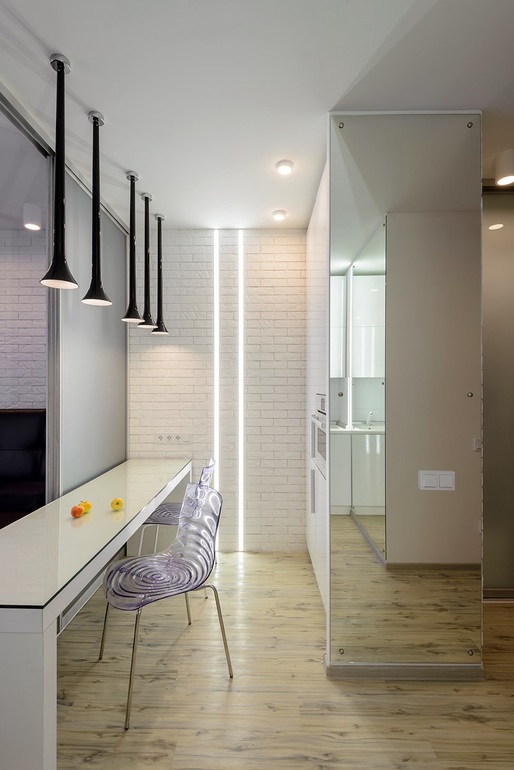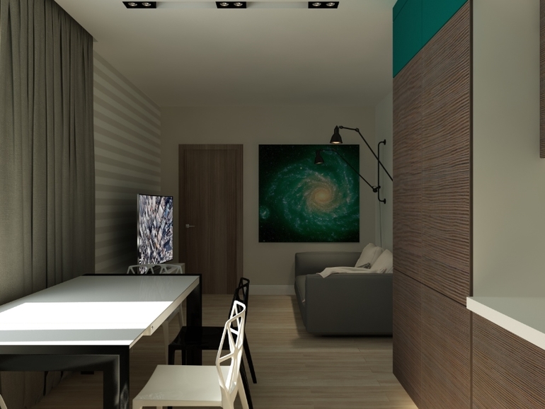 Мы совместили кухню и гостиную, отделили спальню для родителей и оставили комнату для ребенка. Семья выбрала современный стиль, простые формы и отделку. Только немного добавив в каждое помещение "изюминку")