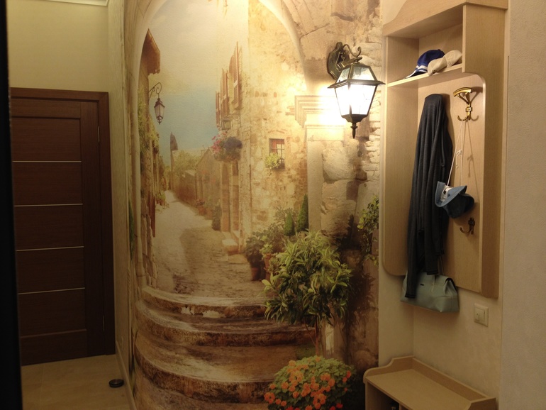 Для того, чтобы расширить данное пространство, я бы посоветовала в нишу спава сделать консоль (или галошницу) с большим зеркалом и светильниками, свисающими с потолка довольно низко. Хороший яркий свет, желательно встроенный в потолок, обязательно теплый. На левой стене использование небольшого по размеру принта на обоях (если это будут обои). Я думаю, результат вас порадует.