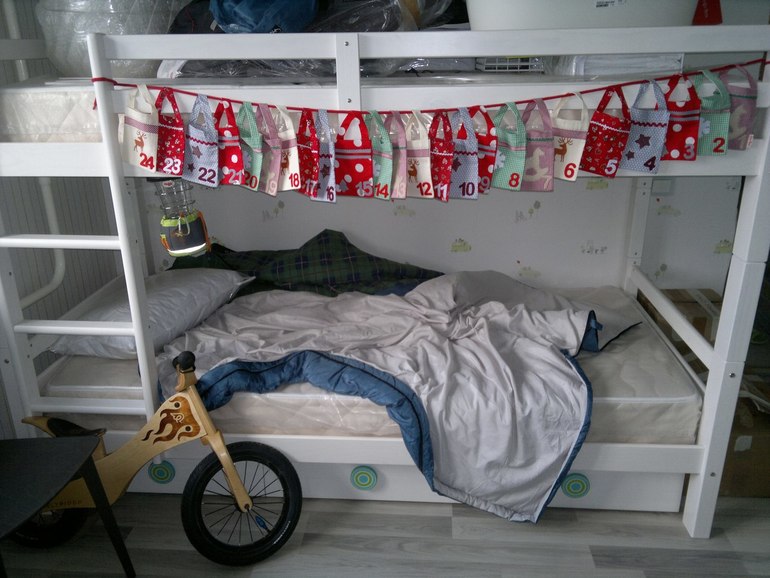 Пока придумала так - на ленте или веревке на пришепках новогодних - числа месяца и какой-то текст с заданиями и подарками.. последнее не продумано.