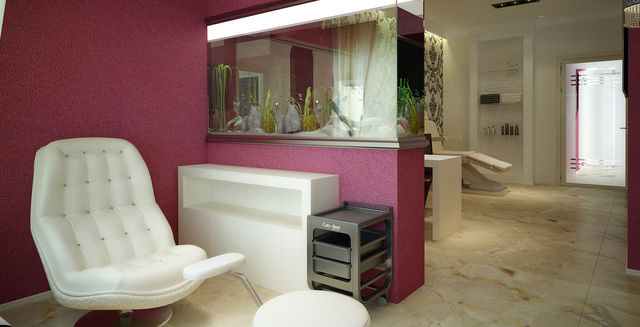 Дизайн салона выполнен в спокойных кремовых тонах, однако здесь гармонично вписалась яркая стена лилового цвета. Дизайнерской находкой является аквариум, встроенный в стену. Рядом располагается зеркало, благодаря которому создается иллюзия аквариума по всей стене, а за счет дополнительного света, который исходит от аквариума, нет ощущения томного помещения. Винтажная черно-белая стена гармонично вписывается в маникюрную зону салона, благодаря темным элементам декора - кожаному креслу для клиента и стойки для косметических принадлежностей. Чтобы не перегружать интерьер, оставшаяся мебель выдержана в светлых тонах в стиле минимализм.