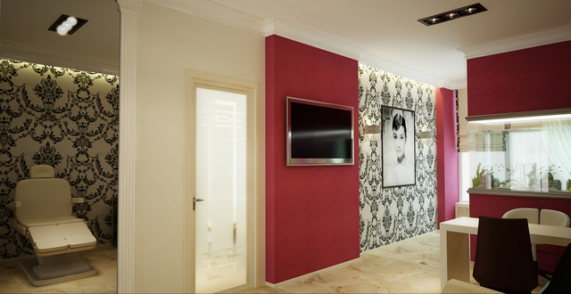 Ярким декоративным элементом при в ходе в салон, является стойка на reception из черного блестящего дерева, с оригинальной вставкой из аквариума, которая огибает ее от начала до конца. Стену с черно-белым орнаментом прекрасно дополняет хрустальная люстра с кремовым винтажным абажуром фирмы «Trea» в стиле арт-деко. Рядом располагается мягкий розовый диван фирмы «Corel».