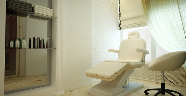 Нежно-кремовое косметологическое кресло, римские шторы на окнах с тем же винтажным рисунком, искусственный камень на стенах и радиаторы, закрытые декоративными решетками - все эти материалы гармонично сочетаются друг с другом.