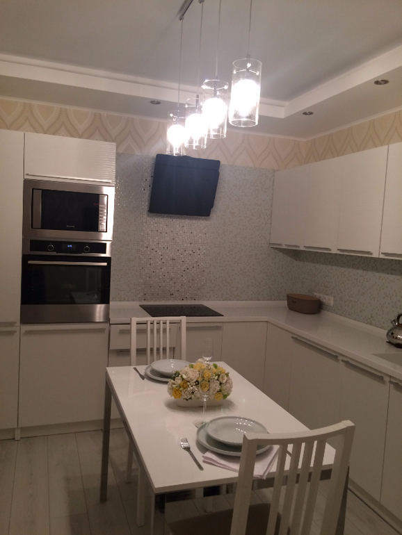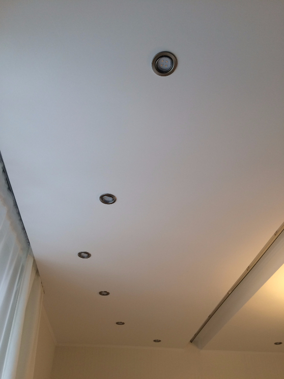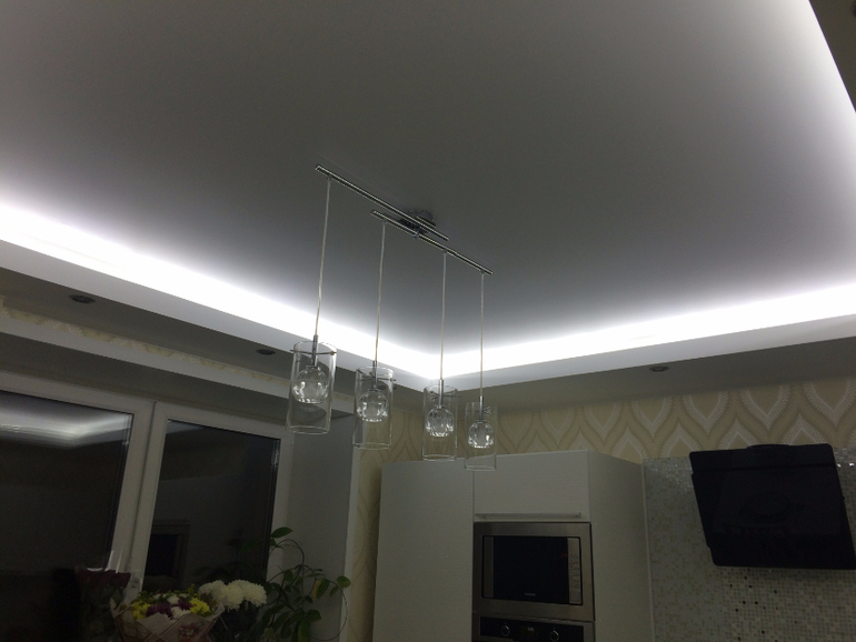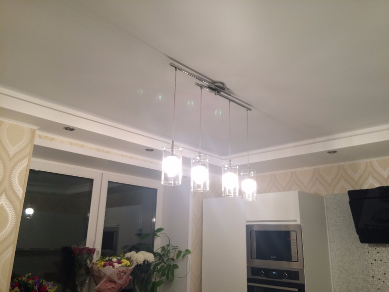 В прихожей, ванной комнате и по центру на кухне натяжные потолки Випсилинг. Нареканий нет, установили все за несколько часов, быстро и аккуратно.