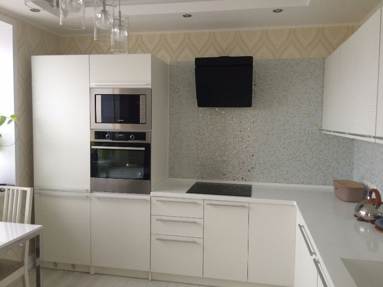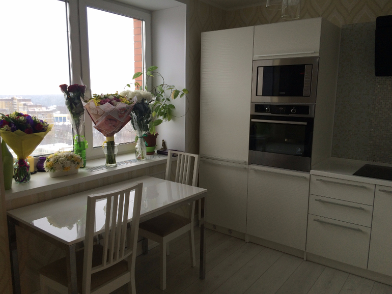 Рядом в окном разместился встроенный холодильник. Далее по часовой стрелке: встроенная духовка Electrolux (с пиролизом), встроенная микроволновка Samsung, индукционная панель Bosch. По другой стене расположились шкафчики, посудомоечная машина Bosch и раковина с измельчителем отходов Bone Crusher. Там же установлен фильтр для воды Аквафор.