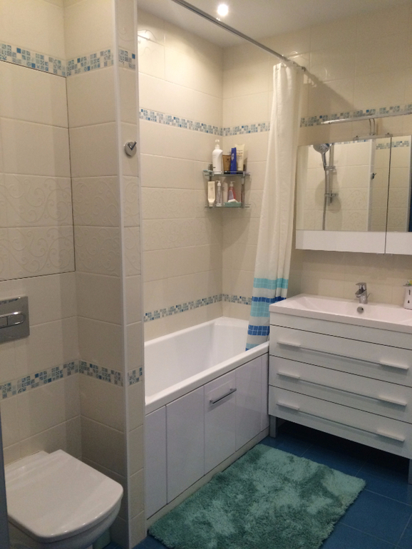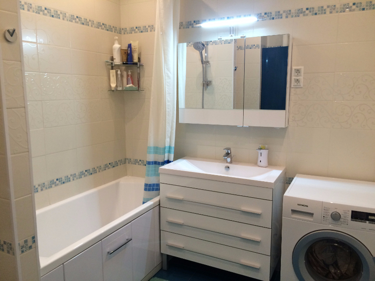Далее по коридору у нас идет ванная комната. Объединив ванну и туалет мы получили большое помещение в 6 кв.м. В предыдущей квартире у меня тоже был совмещенный санузел, так что удобство такого решения проверено на собственном опыте: локтями в стены не бьешься, коленки в дверь не опираются, можно повернуться-развернуться!
