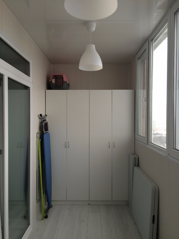 Лоджия не утеплена, но отделана для последующего весенне-летнего проживания собак. так как в шкафах сейчас находится оставшийся строительный материал, то чуть позже все сушилки, гладильные доски, боксы и прочее разместятся в шкафах.