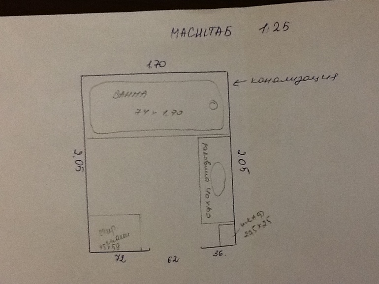 Вот размеры ванной. Карандашом отмечено то, что есть в ванной. Но мне хочется перенести стиральную машинку на сторону раковины и сделать под одну столешницу.
