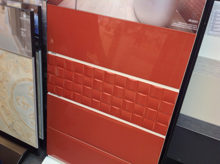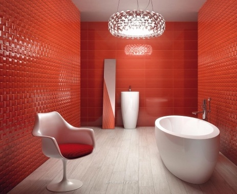 Мое видение: основная плитка белая гладкая, зона раковины фактурная красная, зона ванны - вертикальная полоса фактурной белой