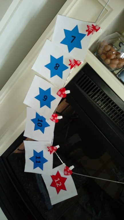 Вот что на -первом этапе. Надо уменьшить карточки и привязать шнур не к телевизору, а к ручкам шкафов, которые стоят по бокам от него.