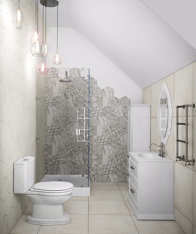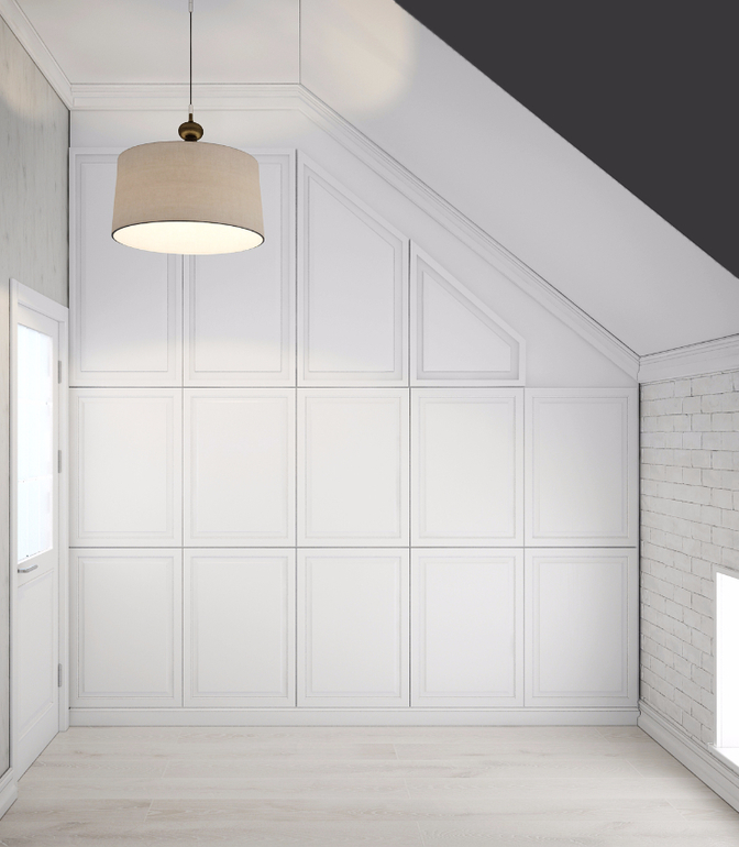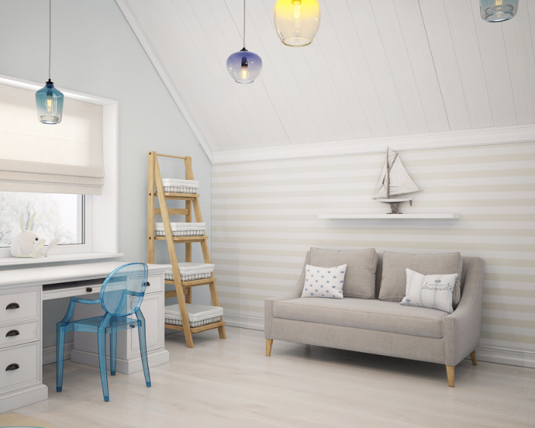 На мансарде очень сложная конструкция потолков. Мне пришлось просто зашить весь этот сумбур под обычный мансардный потолок. Немного покипел мозг, честно говоря, пока разобралась во всем этом.