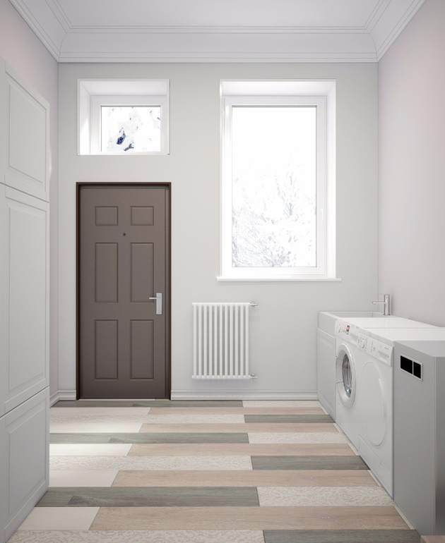 7. Котельная (здесь, кроме самого котла, стиральная и сушильная машина, раковина, душ для помывки колес детской коляски, доп. встроенная морозильная камера и два шкафа для хранения).