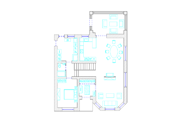 Здесь я только добавила с\у между гостевой и котельной и поставила перегородку для ТВ по центру гостиной (визуально разделив этом зону столовой и гостиной).