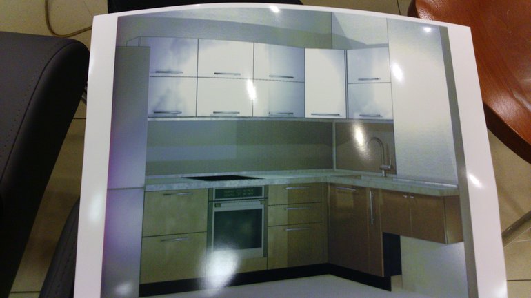 Интерьерное решение кухниДевочки, есть примерный проект кухни. Но, по - моему, тяжеловато смотрятся верхние полки и непонятно, какого цвета делать фартук.