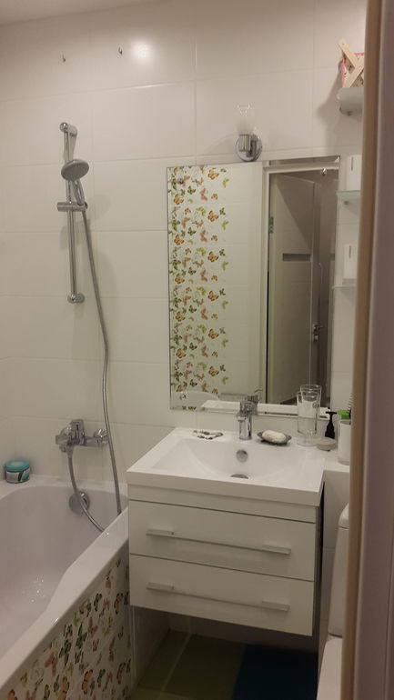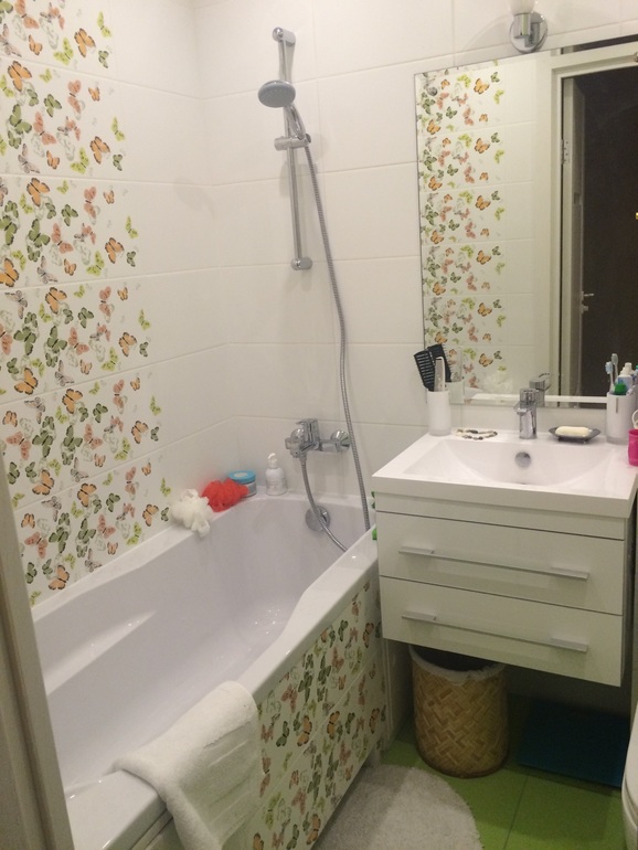Такой классный мойдодыр в ванной, и смесители выглядят качественными. Бабочки перекликаются на зеркале и на плитке. Очень все здорово, интересно потом будет посмотреть на вашу кухню)