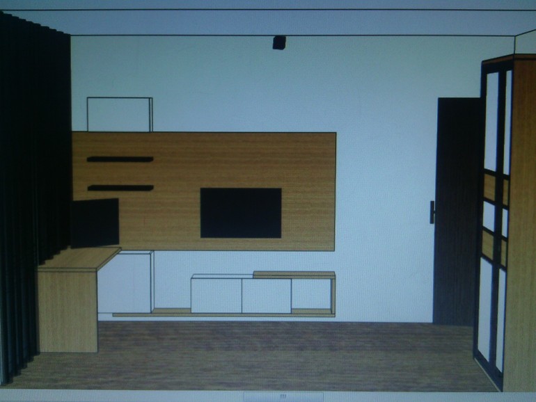 Девочки нужен совет по дизайну комнаты мальчика-подростка..вот уже 2 месяца пытаюсь организовать пространство...пока есть только шкаф и кровать..стена напротив кровати голая..на ней только тв висит. Решили заказать в мебельной студии остальную мебель. И вот что предложили..мне не очень нравится массивная панель на стене..видела что возможно зонировать с помощью полосок из дерева..нашла фото в инете, как бы вы предложили зонировать эту часть стены?