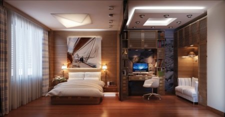 "-" -стеллаж у рабочего стола будет мешать (или нет?), опять же не отделена рабочая зона, а если убрать стеллаж то она вообще будет рядом с кроватью и реально и визуально; уменьшена основная часть комнаты