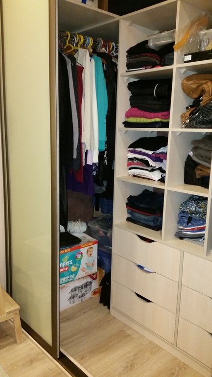 "+" - отдельная гардеробная (всегда приятней переодеваться в приватном месте), сразу за дверью хозчасть за шторой (пылесосы, гладильные доски), малая стоимость гардеробной (можно купить наполнение в леруа-икее, стену сложить из кирпича, покрасить в белый и тем самым реально применить лофт), можно иметь бардак в гардеробной и не париться по этому поводу