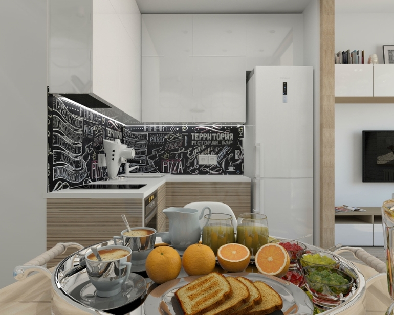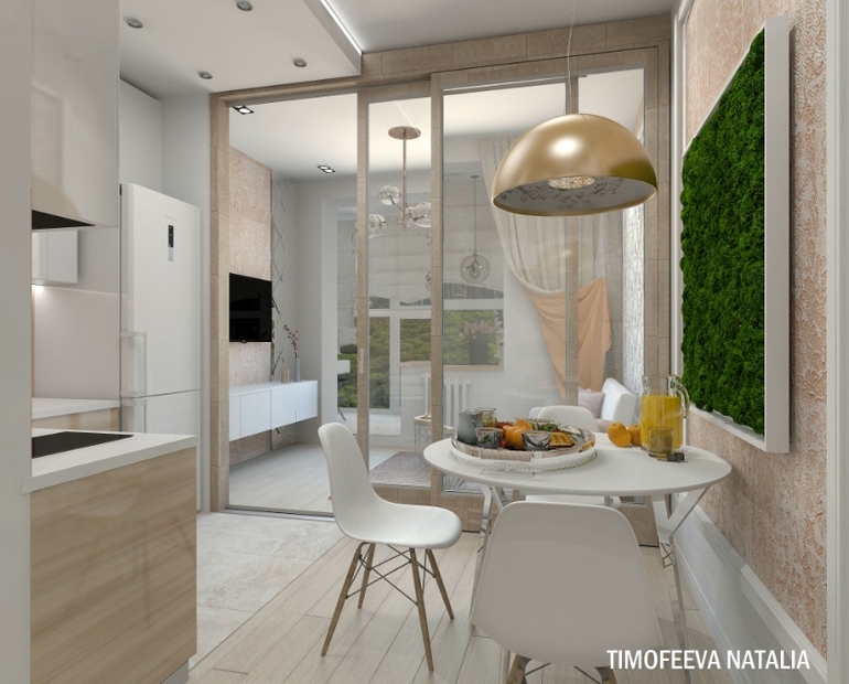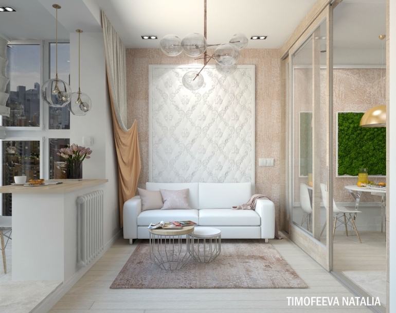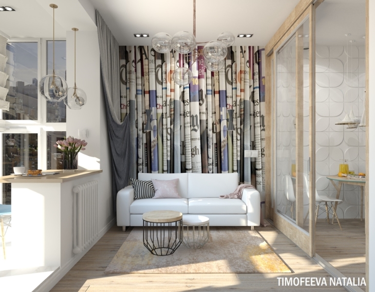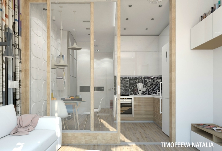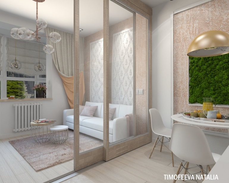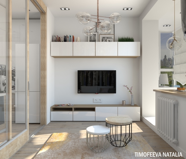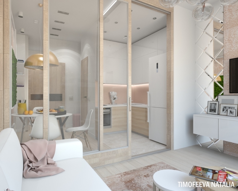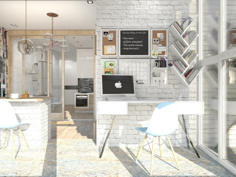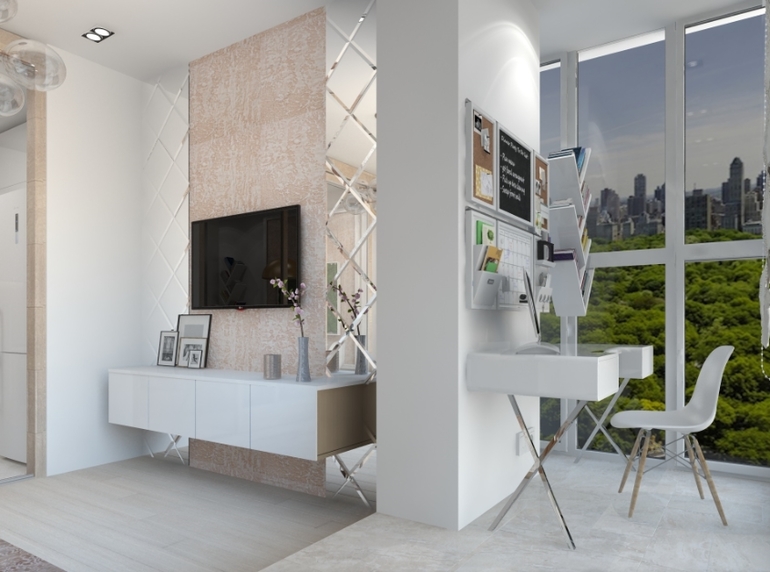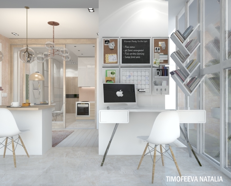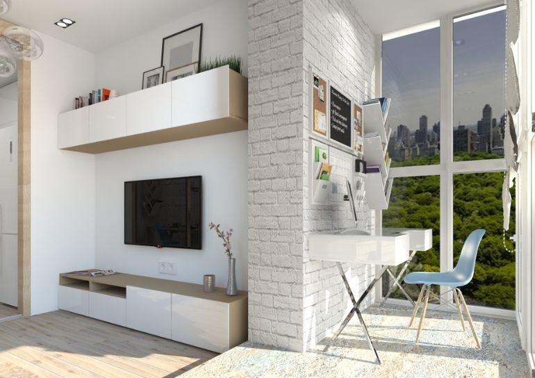 Дизайн проект маленькой студии для девушки. Основным пожеланием хозяйки квартиры было отделить кухню от жилой комнаты. В качестве перегородки были использованы стеклянные раздвижные двери от потолка до пола. Для того что бы визуально увеличить пространство основной цвет стен оставили белый. Балкон объединили с комнатой для того что бы организовать рабочую зону и увеличить пространство. В процессе работы было разработано 2 варианта дизайна.