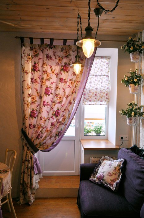 собираемся объединить лоджию с кухней. На Ваш взгляд сочетается ли занавесь цветкая( как на фото именно с цветами) с рейками деревянными,отделку лоджии планирую- деревянной.![]()