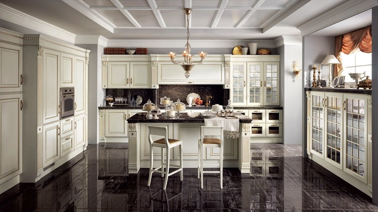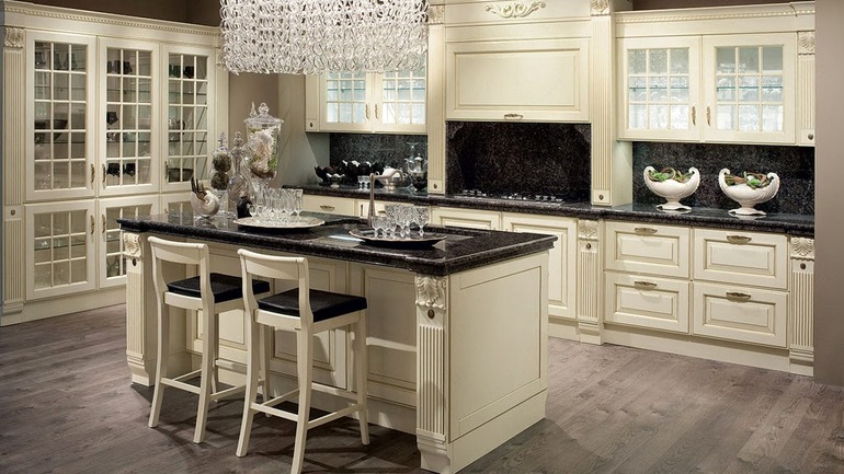 думаю, лучше всего не городить огроменную кухню, а сделать сам гарнитур вдоль стены с коммуникациями, параллельно - можно остров с местом для приема пищи, а дальше большую столовую группу (если нужна такая)