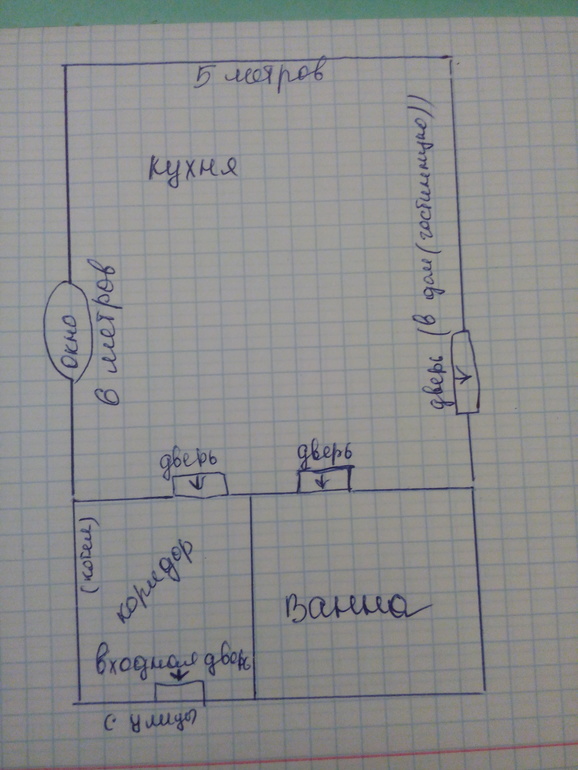 коммуникаций особо там еще никаких нет.только примерно посреди стены где написано 5 метров,вода и слив проведены ,там же примерно будет газ.нагреватель(так по моему называется).девочки и мальчики нужны идеи всего,от планировки мебели ,до цвета обоев.В связи с глобальным ремонтом идей в голове нет вообще.Всем уделившим мне время спасибо...