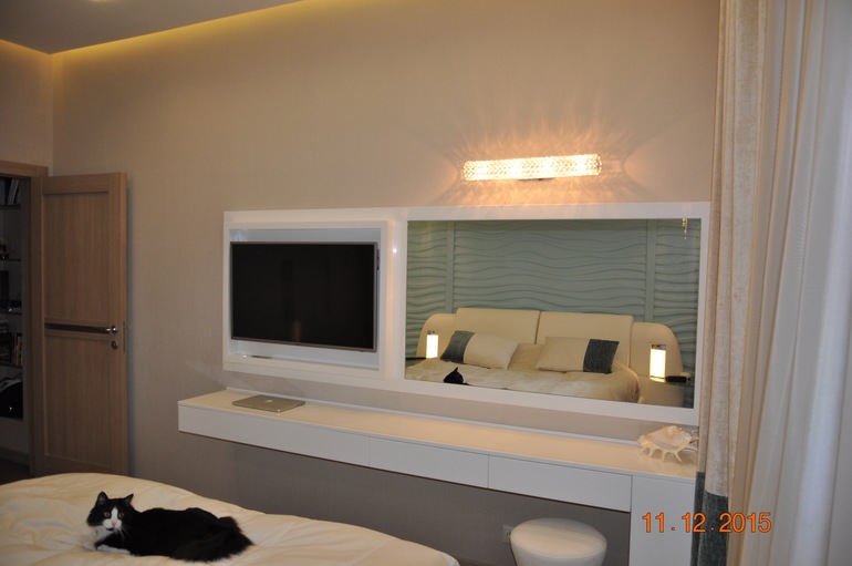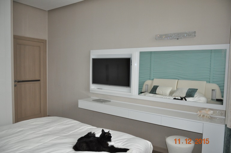 И покажу спальню с включенным освещением. Так как мебель глянцевая - при искусственном свете спальня выглядит иначе
