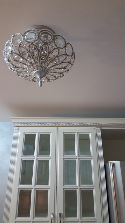 Интерьерное решение кухниДо нового года совсем чуть-чуть, спешим закончить ремонт. Я так и не определилась с люстрами на кухню. Пришлось брать временные в оби. Их две, вторая из этой же серии, только форма чуть иная, спускается над столом, пока еще не повесили. Как считаете, подходит?Или предложите какой-нибудь свой вариант, хочется уже определиться