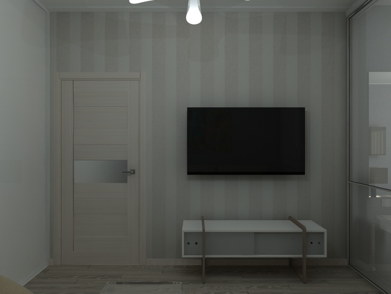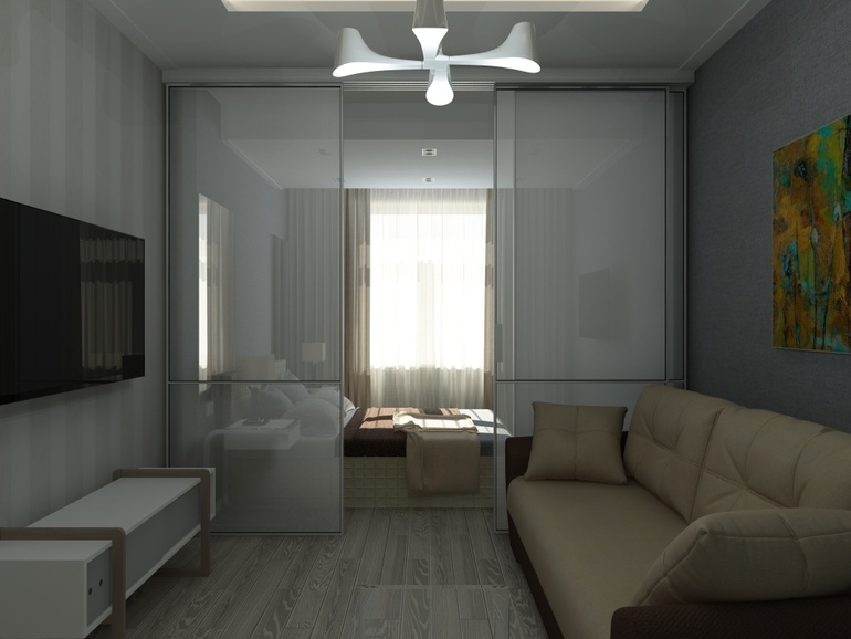 В проекте решено продлить выступы стен и потолочную балку в зоне спальни до дверей-перегородки, сохранив симметрию.