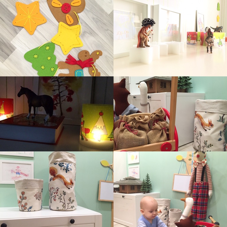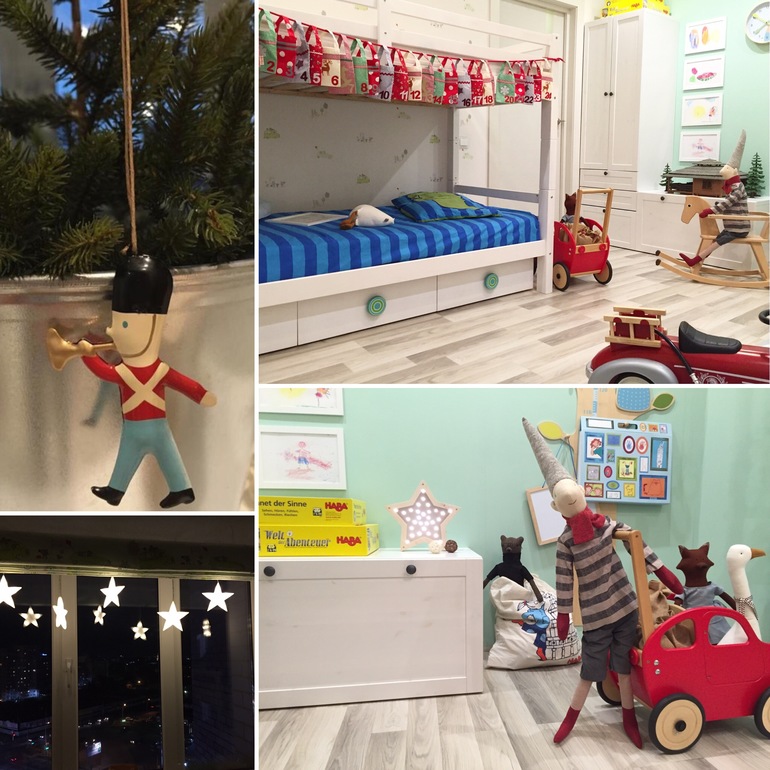 Наша детская украшена следующим образом: на кровати календарь, в машинке рождественский гусь, мешки с подарками, гном (он же и приносит подарки в календарные мешочки), гирлянду сын сам делал, звездочка-светильник, сказочные мешки, различные подсвечники (свечки led), на окне гирлянда из звёзд. Возможно сделаем елочки на окно, повесим снежинки, или оставим до следующего года)