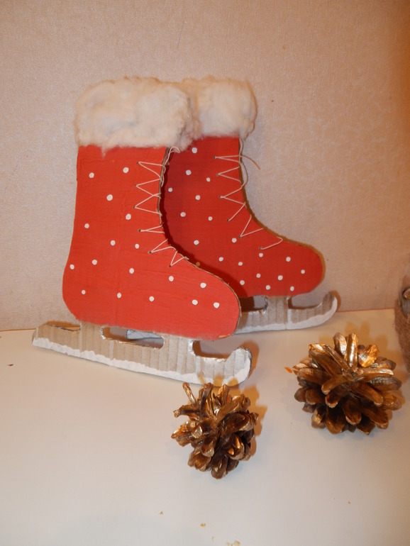 Какая зима без традиционных коньков,пусть будут красные ,нарядные и с мехом естественно)Я такие видела в магазине только из дерева,решила дома из картона сотворить.