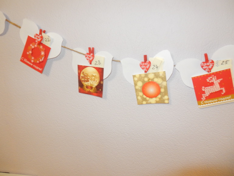 Из открыточек мы сделали адвент календарь,все просто приклеили ,повесили.С завтрашнего дня начинаем приближаться к Новому году все ближе и ближе...