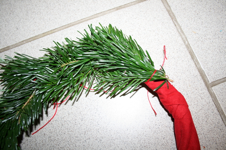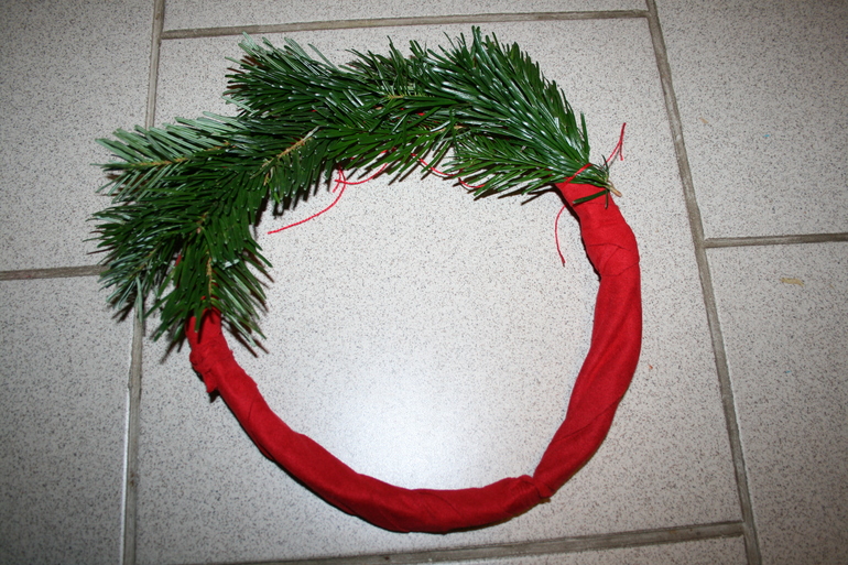Делай три: привязываем веточки к кольцу. Собираем по пучку веточки и ниткой закрепляем вокруг кольца. Нитки должны оставаться с изнаночной стороны. Чем больше веток вы берете, тем пышнее получится венок. Я брала по 3 маленькие веточки, поэтому он жидковат оказался.