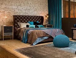 не меняйте шторы, отлично и оригинально смотрятся. Надо уходить от серого на коричневый-шоколадный. Еще добавлю, что в гамме бирюза-шоколад-фиолет эффектнее смотрится темная мебель, двери и пол. Площадь комнаты большая, не бойтесь темных обоев, зрительно они не уменьшат объем, а придадут уют